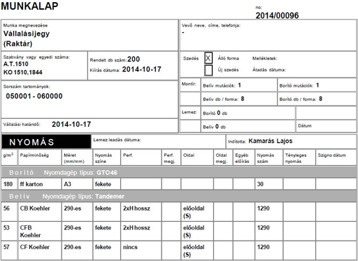 A gyártáshoz szükséges munkát kiadhatjuk feladatok vagy munkalapok formájában is a Woodpeckerben, attól függően hogy mi illeszkedik jobban a cég hatékony működéséhez. Ettől függ az is hogy milyen adatokat, milyen formában kell feltüntetni a munkavégzők számára. A példán látható munkalapra a dolgozók például kézzel rögzítik a megvalósult számokat és megjegyzéseket, amit a műszakvezető rögzít vissza a rendszerbe.