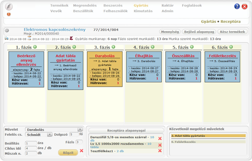 Minden cég másként szervezi gyártását, és így eltér a segítség is amit a Woodpeckertől elvár. A pontosabb munka és ellenőrzés részletesebb ismereteket igényel, ami a rögzítendő adatok mennyiségében is lecsapódik. Kiragadott példaként ezen a képen egy gyártási folyamat receptúrája látható, ahol a megrendelő kérésére műveletenként megadható az alapanyag igény illetve a sorrendi függőség.